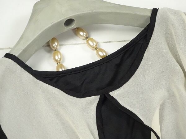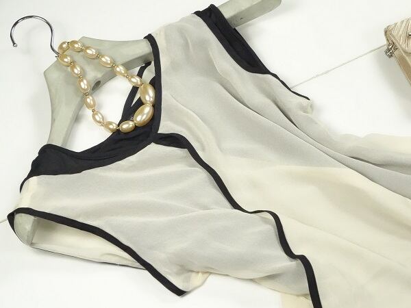 ワンピースとシフォンのトップスのセットアップ。ワンピースはやわらかなジャージ素材、ノースリーブで黒一色のAライン。トップスはカシュクール風、黒のトリミングがアクセントのベージュのシフォン。背中側が大きく開いていて前後で違った印象に。ワンピース、トップス別々でも楽しんで頂けます。エレガントで優しい雰囲気をもった一着です。ファスナーなしのかぶるタイプ。裏地なし。