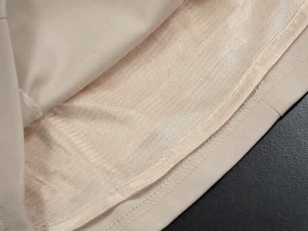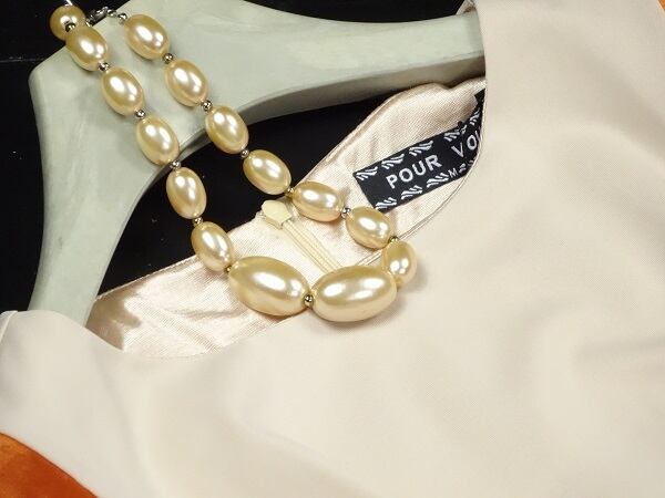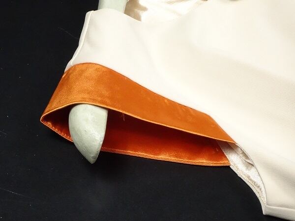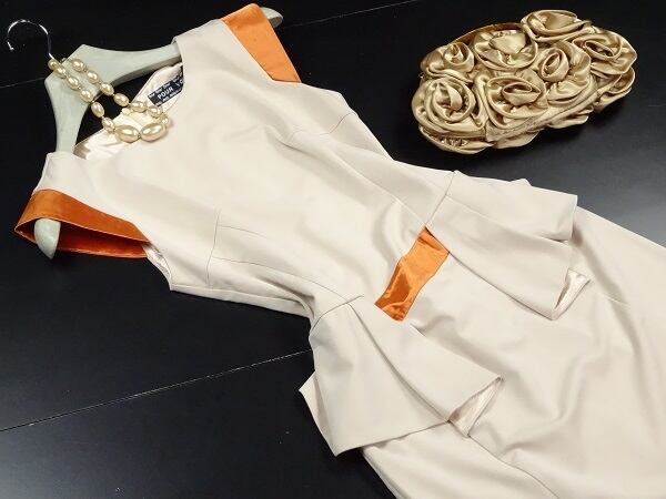 オレンジバイアスアクセントペプラムタイプのワンピース。しっかりとしたベージュの生地がペプラムデザインをきっちりとした印象に仕上げています。袖ぐりとウエストにはオレンジカラーのサテンをあしらい、ウエストはサイドから中央にかけてフリルをとった変形ペプラムデザイン。裏地はつややかなシャンパンゴールドカラー。スレンダーなラインがクリエイティブな印象を与えてくれる一着です。若干伸縮性あり。バックファスナー。裏地有り。