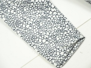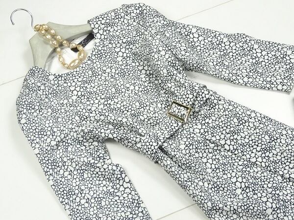 モノトーンアニマル柄長袖のワンピース。ツイードのようなしっかりとした生地全体にモノトーンのアニマル柄がプリントされています。ウエストから大きなタックをとり、ゆるやかに裾まで広がっているので足元が楽。ウエストには友布のバックル付きベルトがついています。きっちりとした印象ですのでフォーマルなシーンにも着用いただけます。バックファスナー。ベルト付き。裏地有り。