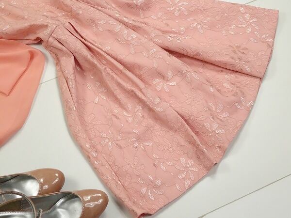フェイクパールアクセ付き花刺繍チュールのワンピース。細かなピンクのネットチュール地にピンクの糸で花模様を刺繍。襟元には大きなフェイクパールのアクセサリー。袖はしなやかなシフォンを使用。ウエストにかけて大きくタックをとり、ゆったりとしたフレア仕立てになっており、キュートで華やかなデザイン。パーティやイベント、コンサート、結婚式にと、さまざまシーンで活躍してくれる美しい一着です。背面ファスナー。裏地付。