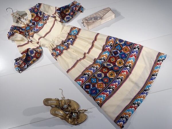 とろみ生地ボーダー幾何学模様のワンピース。やわらかな生地に、カラフルな幾何学模様をプリント。胸もとは中央に三角の切込みが入り女性らしさをアップ。ボーダー間の落ち着いたクリームカラーが、全体の派手さを消し、フェミニンな印象に仕上げています。普段着に、ちょっとしたお呼ばれにと、さまざまシーンで活躍してくれる一着。背中ファスナー。裏地付。