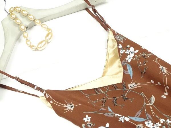 裾切り返しプリーツロング丈のキャミワンピース。胸元は浅いV字カット。裾は低い位置で切り返し、裾までが約1.5cm幅のプリーツ仕様になっています。落ち着いたワイン系ブラウン時に水彩画のような花柄をプリント。リゾート地はもちろん、パーティやイベントなど、さまざまシーンで活躍してくれる魅力的な一着です。肩ひもはアジャスター付きで長さ調整可能。ファスナーなしのかぶるタイプ。裏地あり。