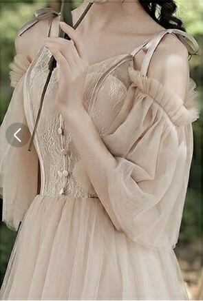 胸元レースとチュールのロングドレス。ピンクのサテン地にチュールを重ね全体的にフェミニンでエレガントな雰囲気に。上半身はレース仕立てで下半身はチュールを使用しエレガントな印象に。パーティやイベント、結婚式など、様々なシーンで、気品のある印象を与えてくれる一枚です。裏地有。背中編み紐掛け。腰下ファスナ-有。胸パット付。