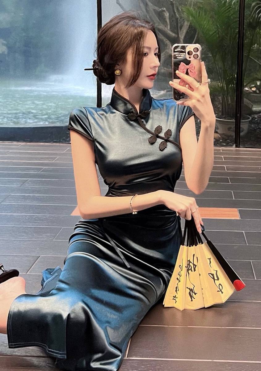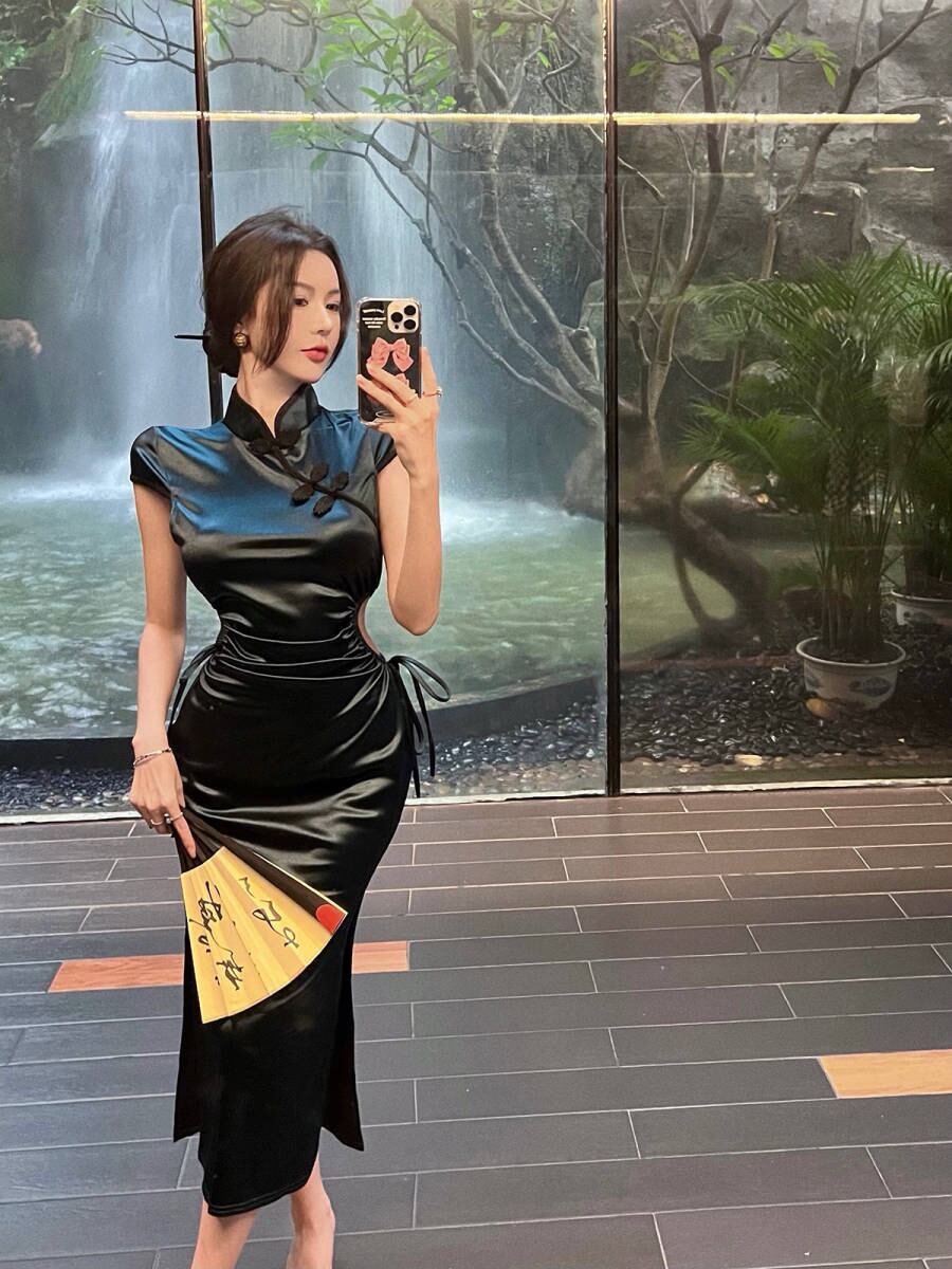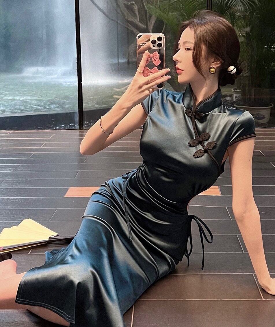 光沢ミディアムチャイナドレスです。スリムな大人の女性を醸し出してくれる一着です。伸縮性はございます。裏地なし。背中ファスナ-有。右サイド40cmのスリット有。!!タグはMサイズですがサイズ的にはSサイズになります。