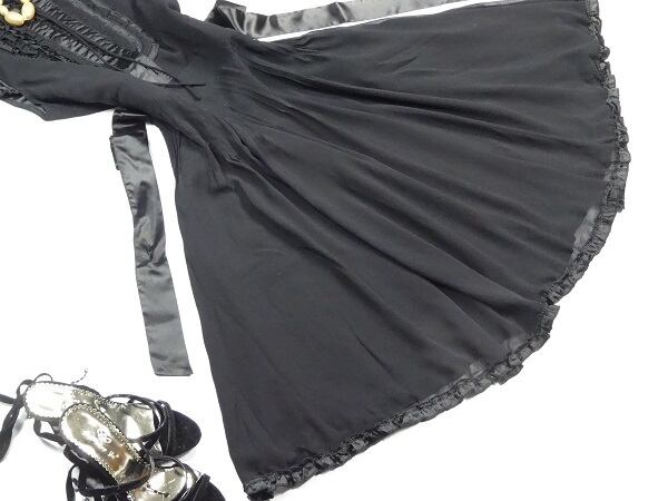 ファッション性に優れたとても美しいエレガントなワンピ-スです。デザイン性のあるスタイルが魅力的。胸元のフリルがとても豪華です。裏地あり。左脇下ファスナ-あり。