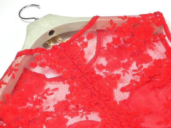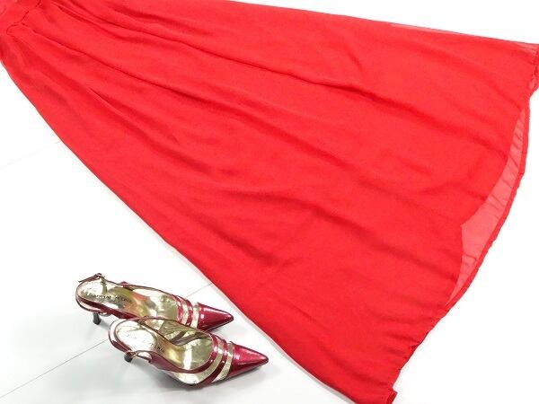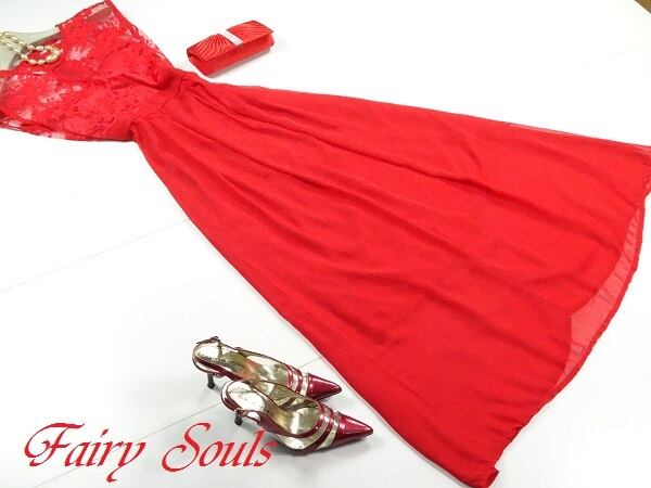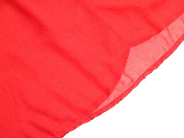 花刺繍ウエスト切替赤のドレス。トップス部分には鮮やかな赤の花模様を刺繍。ほんのり透け感がセクシー。ウエスト切替で、スカート部分は柔らかなシフォンをたっぷり使用したフレア。品の良いフェミニンなデザイン。背中のほんのりとした透け感が上品な女性を表現してくれています。パーティやイベント、コンサート、結婚式にと、さまざまシーンで活躍してくれる美しい一着。背中ファスナー。裏地付。
