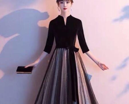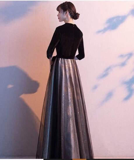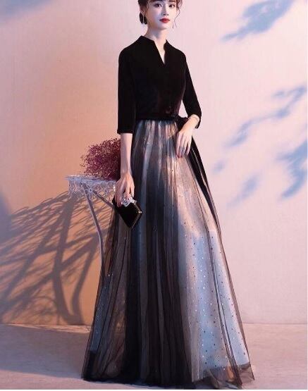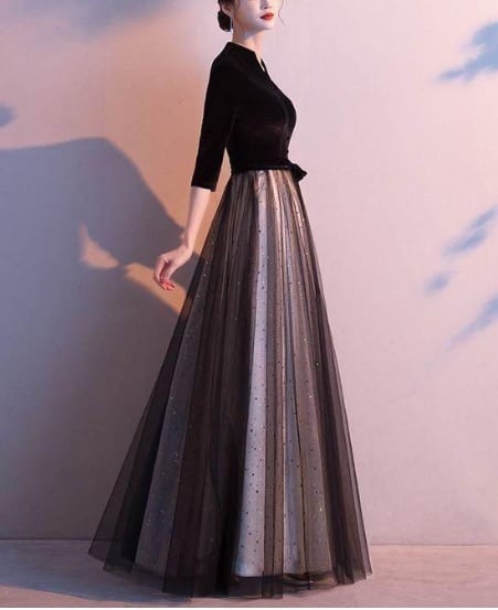 異素材パ-ティ-ロングドレス。胸元はV字にカットが入り、ウエストまでクルミボタンがアクセントについています。ウエストから裾までは、濃いシルバーグレーのサテン地に小さな星をプリントした黒のチュールを2重に重ね、気品に満ちたとてもエレガントで上品なデザインになっています。パーティ、結婚式の二次会、コンサートにと、フォーマルなシーンに大活躍してくれる人品です。ウエストには取り外し可能なベルベットのウエストベルトが付いています。裏地あり。背中ファスナ-有。