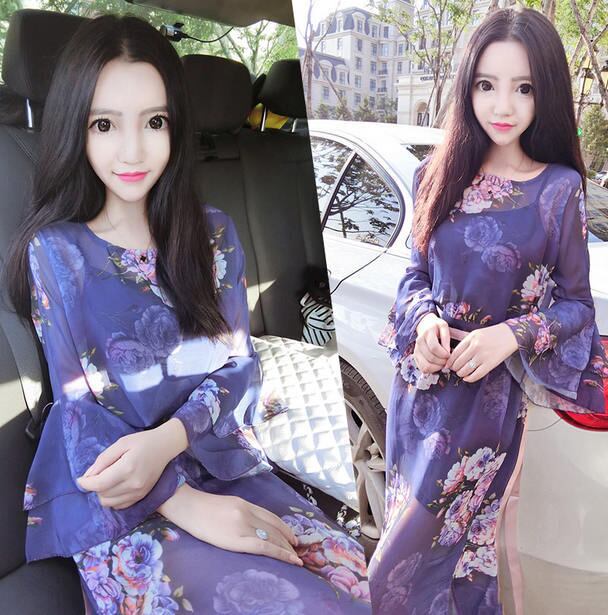 サイドスリット袖フレアセクシーなロング丈のワンピース。やさしいラウンドネックに、袖の先はたっぷりとしたフレア使用になっています。胸から裾にかけてストレートにラインがのび、両サイドは、裾から上約40cmにかけてスリットが入っています。黒のインナー付き。インナーは膝上までで、足がほんのり見える透け感がセクシーな大人の女性を表現してくれています。パーティやイベント、コンサート、結婚式にと、さまざまシーンで活躍してくれる美しい一着。ファスナーなしのかぶるタイプ。布ウエストベルト付き。