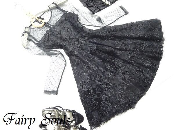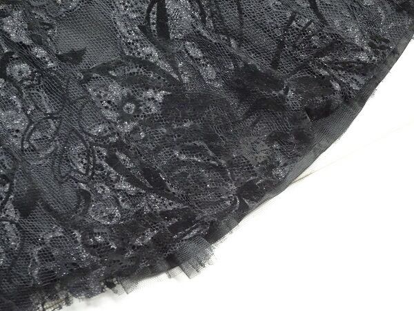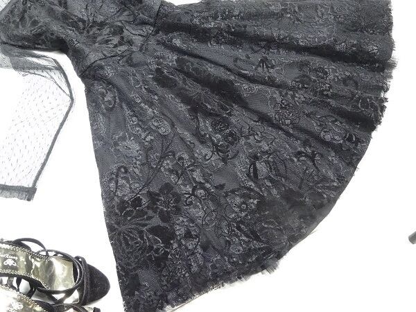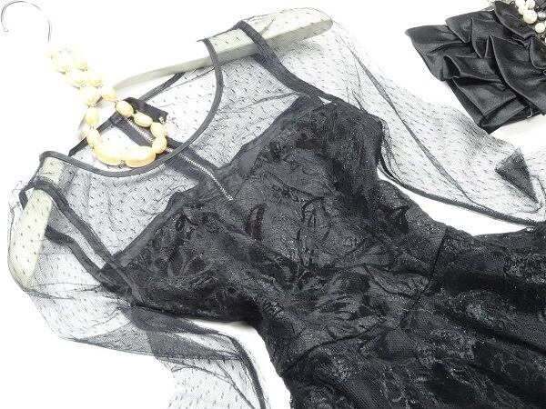 黒のエレガントなワンピ-スです。デザイン性のあるスタイルがとても魅力的な一着です。可愛いデザインで全体的に優しい感じに仕上げられています。裏地あり。背中ファスナ-有。