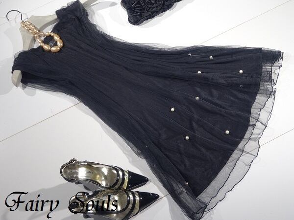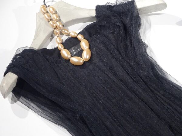 黒のキュートなドレスワンピです。全体的にチュ-ルが重ねられたとても女性らしい一着です。着る人の魅力を十分に引き出してくれる一着です。裏地あり。ファスナーなし(かぶるタイプ)。