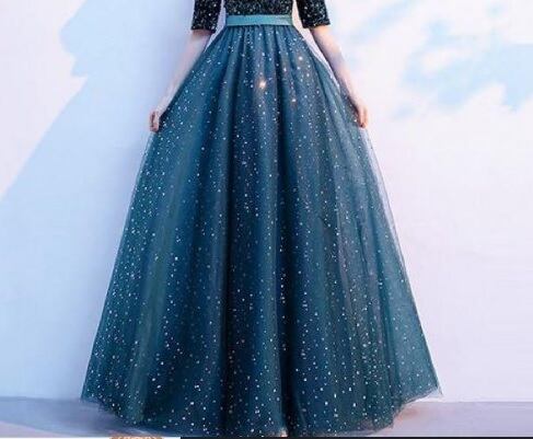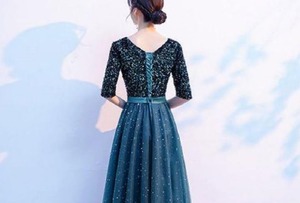 スパンコール切替ロングドレス。鮮やかな緑のサテン地の上に、上半身には同色のスパンコールをふんだんにあしらい、ウエストから裾にかけてはサテン地に小さな星のスパンコールを配した同じグリーンの2枚重ねのチュールをふんだんに使用し、大変気品に満ちたエレガントで上品で、かつ豪華なひとクラス上をいくデザインとなっています。結婚式の二次会、パーティ、コンサートにと、はなやかなシーンにピッタリの一着です。背中網掛け。背中腰から下ファスナ-有。裏地なし。胸パット付き。