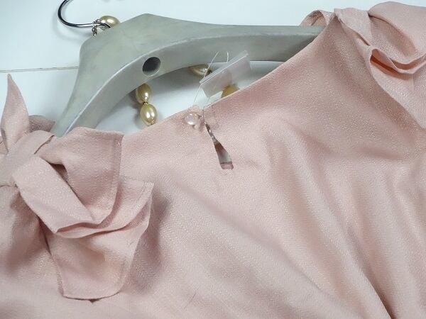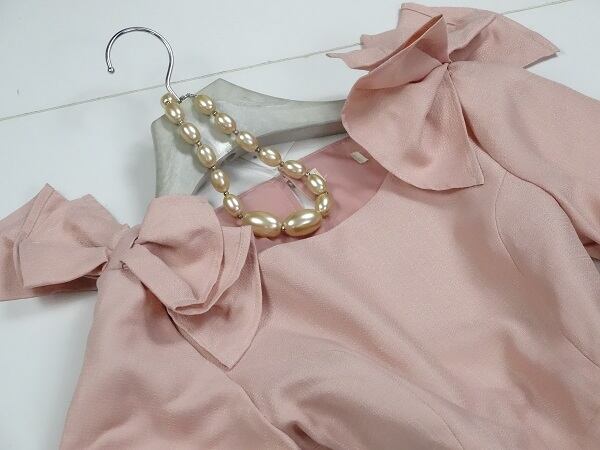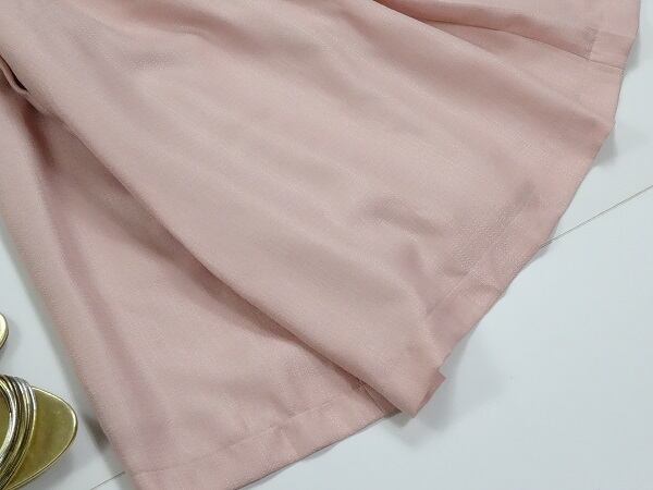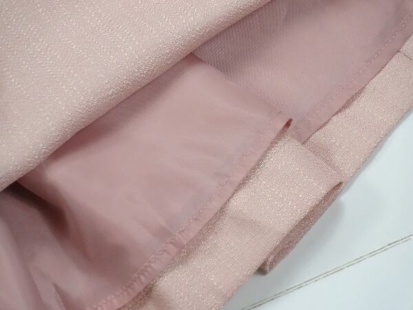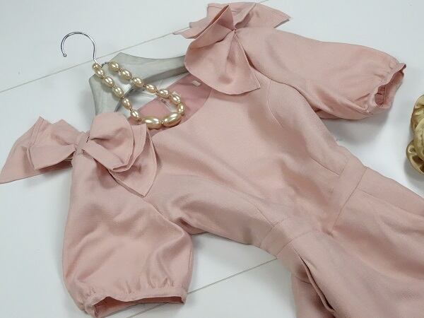 肩フリルリボンタックフレアピンクのワンピース。ツイード風のピンクの生地でしっかりとした印象。肩には共布でリボンを飾り、ふっくらとした袖が二の腕をしっかりカバー。ウエストで切り返しが入り、タックをとったスカートは生地をたっぷりとったフレアタイプ。可愛くフェミニンなデザインです。パーティやイベント、コンサート、結婚式にと、さまざまシーンで活躍してくれるキュートな一着。ファスナーなし。後ろボタン1つ留め。裏地付。