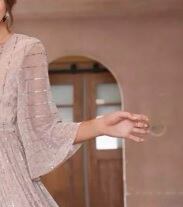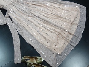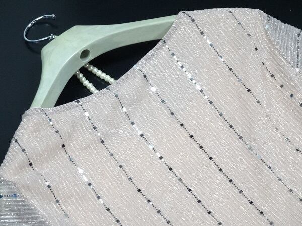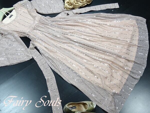ビジュ-飾りロングパーティ-ドレスです。全体的に縦にシルバ-のビジュ-が施され動くたびに光のかげんでキラキラと輝き又、全体的にふんわりした印象に。袖先が広がったふんわりとしたデザインの袖が優しさを演出。裏地あり。ファスナーなしのかぶるタイプ。共布ウエストリボンベルト付き。
