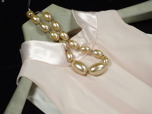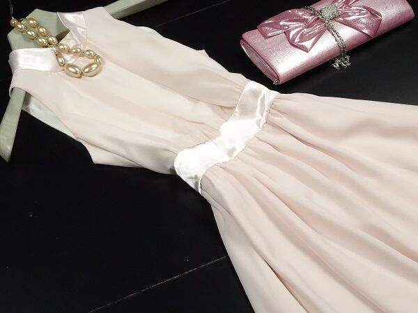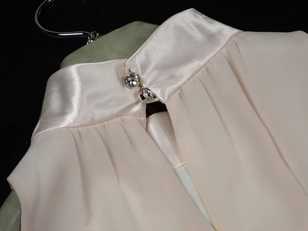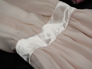 首元とウエスト部分に同色の光沢生地を使用したとてもエレガントなワンピ-スです。ふわ-としたシフォンフォ-マルワンピ-スです。軽くて着心地もとても良いです。左脇下ファスナ-有。裏地有。