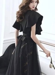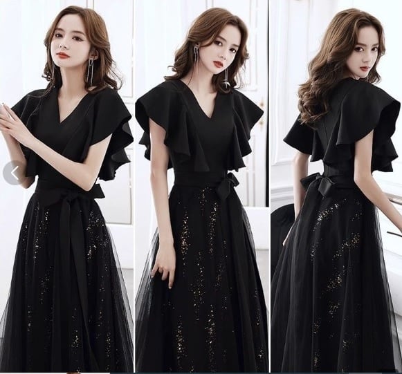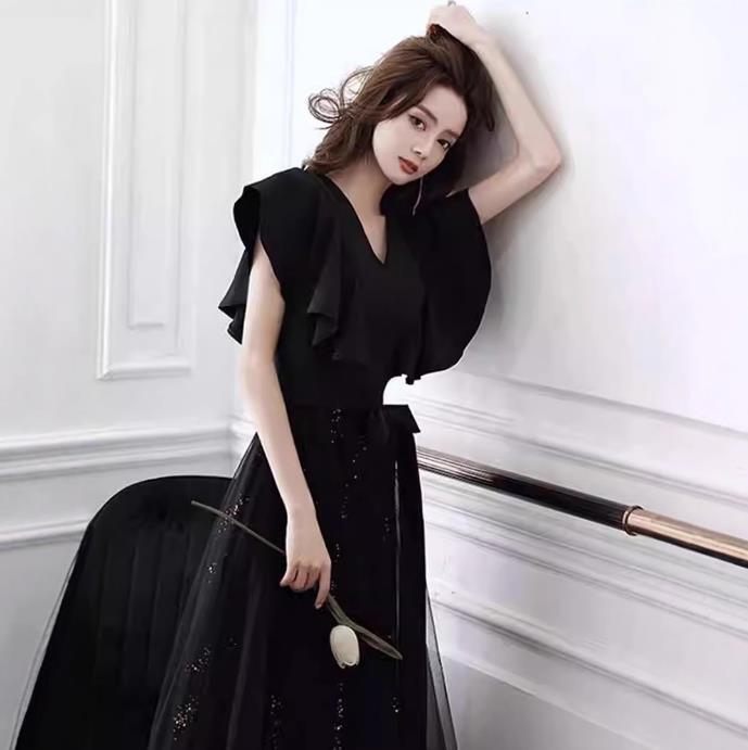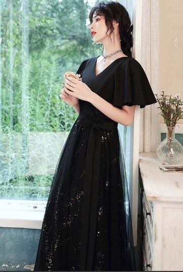 異素材チュールのパ-ティ-ロングドレス。胸元はV字にカットが入り、上半身はスーツ素材のようなしっかりとした生地で、ウエストから裾までのスカート部分は下に金のスパンコールをちりばめたチュールとその上に無地のチュールを重ねた二重仕様になっています。袖はノースリーブの上に約15cmほどの長さのフリルがかぶさっていて、全体的にボリューム感があり、気品に満ちたとてもエレガントで上品なデザインになっています。パーティ、結婚式の二次会、コンサートにと、フォーマルなシーンに大活躍してくれる人品です。ウエストには取り外し可能な黒のリボンベルトが付いています。裏地あり。背中ファスナ-有。