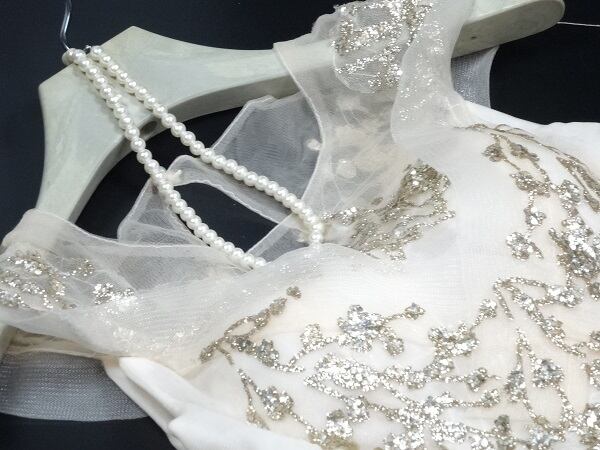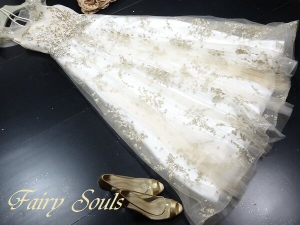 チュールとスパンコールのロングドレス。白のサテン地の上にチュール地を二重に重ね、金色のスパンコールとビーズをふんだんにあしらった大変豪華で美しい仕様。デコルテの透け感がとても美しく大人の女性を醸し出してくれるエレガントなデザイン。全体にゴールドのスパンコールがちりばめられたデザイン性のあるスタイルがとても魅力的な一着です。華やかであり、また上品な印象に仕上げられています。背中腰下まで編み紐掛け ファスナ-なし。胸パット付き。結婚式の二次会やお色直しに最適です。