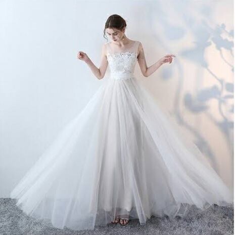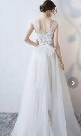 チュ-ル重ねウエディングドレス。胸元には立体刺繡が施されウエストから下のスカート部分はサテン地にチュ-ルを2枚重ね前より後ろの丈が長いフィッシュテールで女性らしい華やかな印象に。右サイドがファスナーになっていて着脱しやすく豪華な一着です。右サイドファスナー有。胸パット付き。同チュ-ルベルト付き。