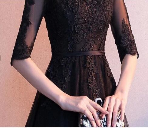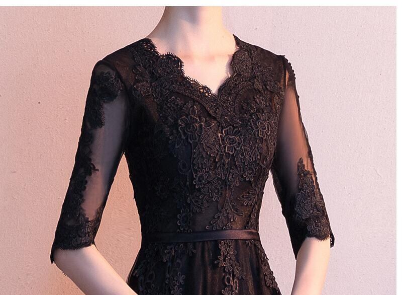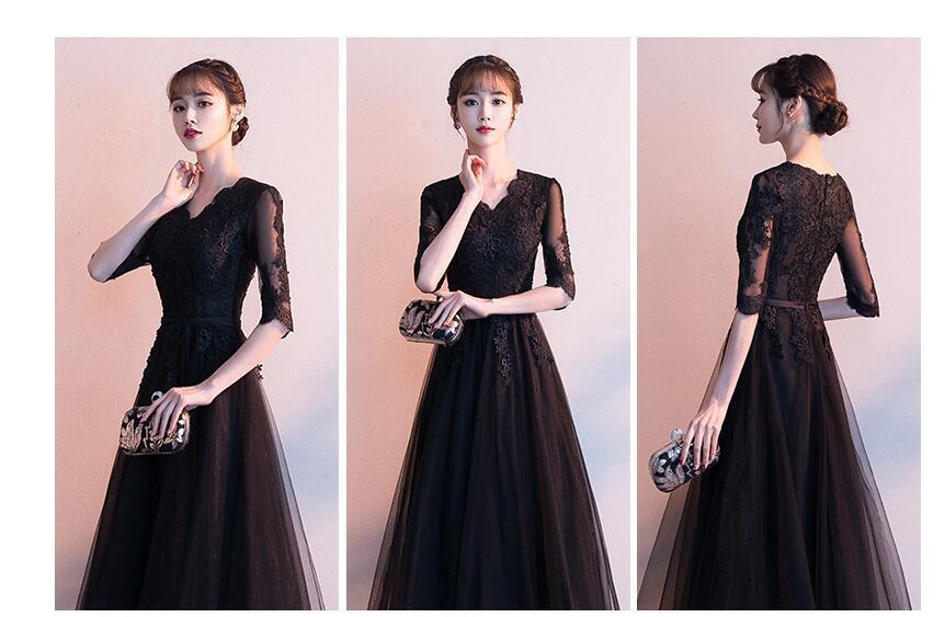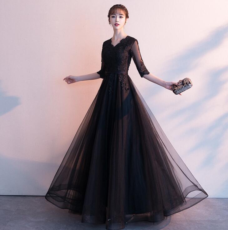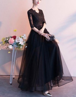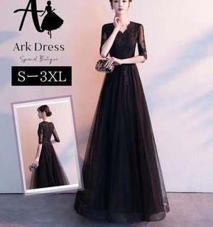 立体刺繍ロングチュ-ルパ-ティ-ドレス。シックな黒のサテン地の上に、同色の立体刺繍をほどこしたチュ-ルが重ねられた豪華でフェミニンなデザイン。V字の胸元が大人の雰囲気を醸し出し、シックで上品な女性を表現。パーティやイベント、コンサート、結婚式にと、さまざまシーンで活躍してくれる美しい一着です。背中ファスナー有。胸パット付。