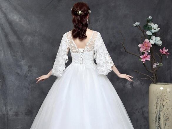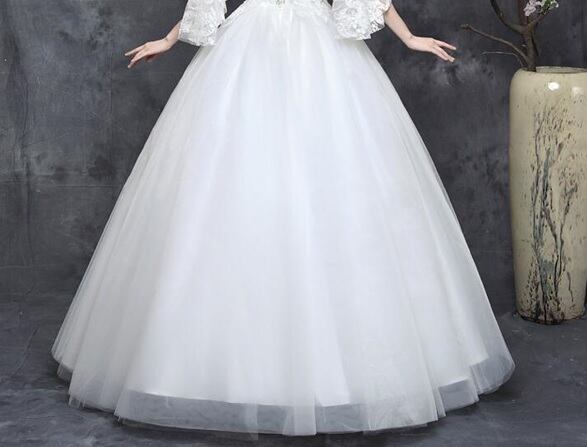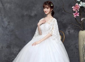 ネットチュールのウエディングドレス。トップス部分はVの字にカットされたデコルテラインが胸元を美しく魅せていて、肩紐の付け根からチュールのフリルをあしらい二の腕をしっかりカバー。胸元からウエストにかけてのフェイクパールをあしらった刺繍が美しさを倍増しています。背中はヒップまで編み紐掛けになっていて、紐の締め具合でバストサイズとウエストサイズを調整できます。デザイン性があり、豪華かつエレガントな雰囲気を醸し出しています。ウエディングドレスとしても、また、パーティやイベント、結婚式など、様々なシーンで、気品のある印象を与えてくれる一枚です。裏地あり(サテン地とチュールの2枚重ね)。背中編み紐掛け。胸パット付。