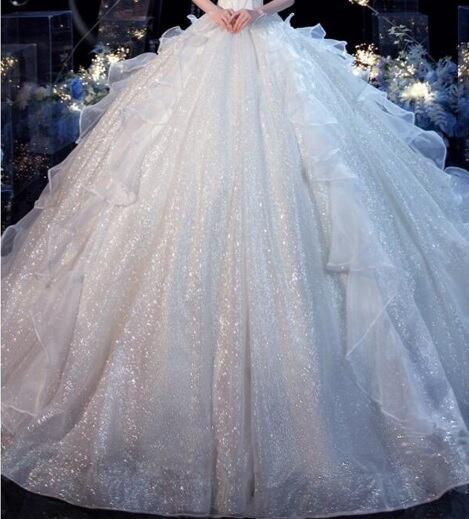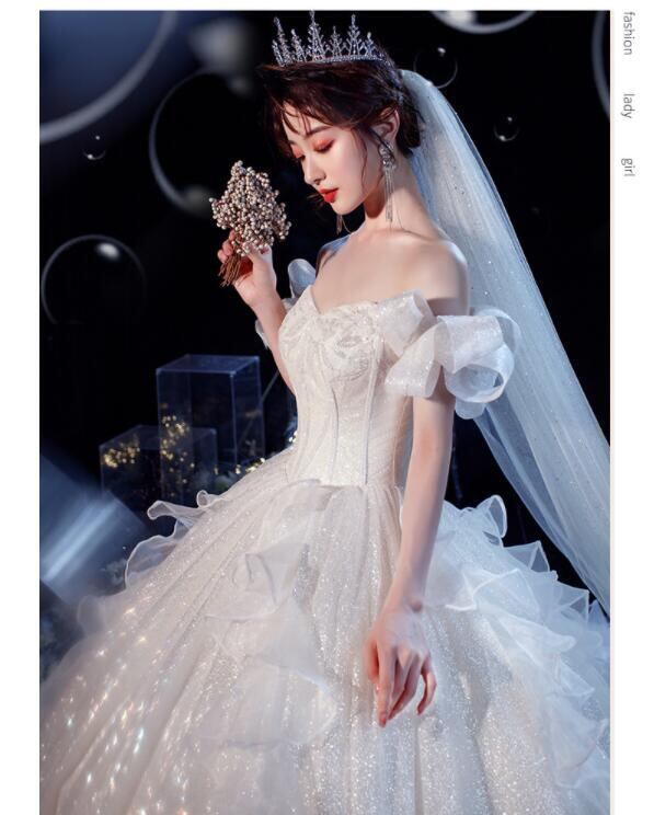 ネットチュールのウエディングドレス。トップス部分はハートカットされた胸元に銀のラメを花びら状にちりばめた様子が美しく上品な印象を与えています。オフショルダーの肩先からはしっかりとしたネットチュールが大きなリボンのようなラインを描き二の腕をしっかりカバー。ウエストからすそにかけては細かな銀のラメをふりかけ、サイドにはネットチュールのフリルをあしらい美しさを倍増しています。背中は腰まで編み紐掛け、腰から下はファスナーになtっているので着脱しやすくなっており、紐の締め具合でバストサイズが調整できます。パニエが付いているのでスカート部分にボリューム感が出せ、またデザイン性があり、豪華かつエレガントな雰囲気を醸し出しています。ウエディングドレスとしても、また、パーティやイベント、結婚式など、様々なシーンで、気品のある印象を与えてくれる一枚です。裏地あり(サテン地とチュールの2枚重ね)。背中腰下まで編み紐掛け。ファスナー有。胸パット付。