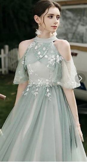チュール肩見せミディアム丈パ-ティ-ドレスです。サテン地に若草色のチュールを2重にかぶせたエレガントなデザインです。袖は肩をみせて二の腕からフリル仕様になっています。トップス部分から袖にかけての刺繍がエレガントで大人の魅力をアップ。パーティやイベント、結婚式など、様々なシーンで、気品のある印象を与えてくれる一枚です。背中結び紐有り。背中腰から下ファスナ-有。胸パット付