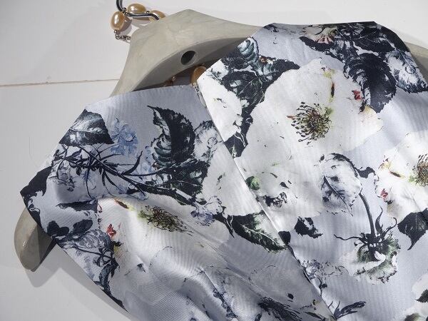 光沢のある生地使用で高級感があるとてもエレガントなワンピ-スです。可愛らしいデザインで全体的に優しい感じに仕上げられています。背中ファスナ-有。裏地あり。ベルト付き。