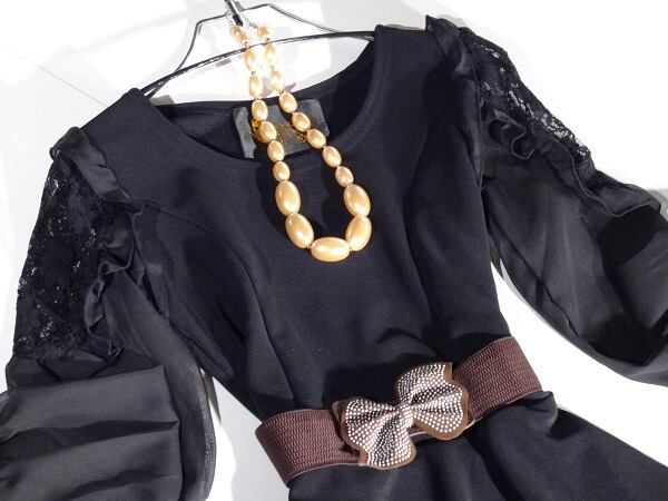 レースとシフォンの切替が魅力的なワンピース。襟は優しい印象のラウンドネック。袖は肩先からひじあたりまでがレース仕様で、ひじから手首まではシフォン地。本体の生地は伸縮性のあるのでゆったりと着用いただけます。ファスナーなしにかぶるタイプ。大きなリボンのバックルがキュートなベルト付き。裏地あり。