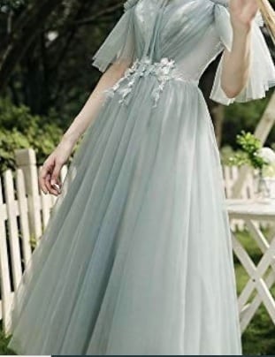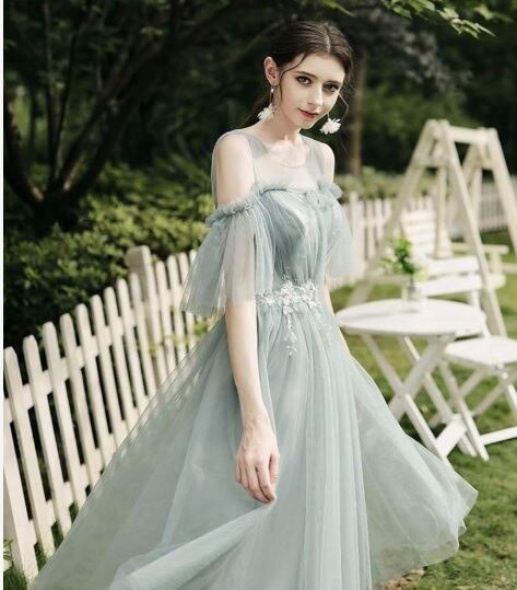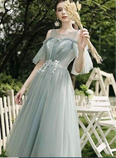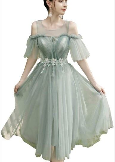 チュール肩見せミディアム丈パ-ティ-ドレスです。サテン地に若草色のチュールを2重にかぶせたエレガントなデザインです。袖は肩をみせて二の腕からフリル仕様になっています。パーティやイベント、結婚式など、様々なシーンで、気品のある印象を与えてくれる一枚です。背中結び紐有り。背中腰から下ファスナ-有。胸パット付。