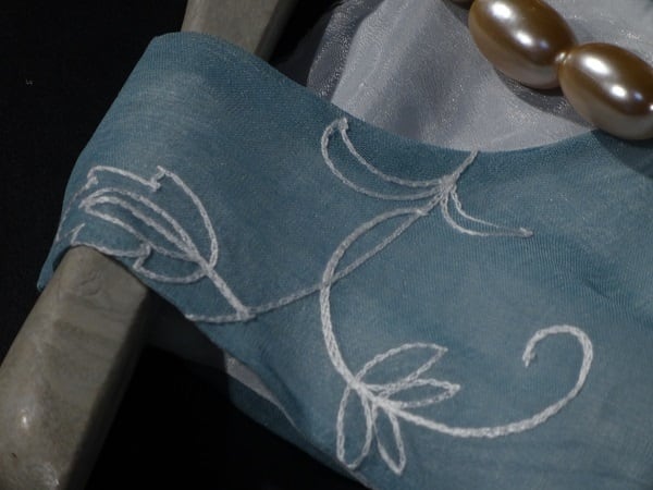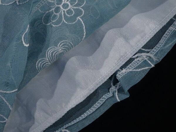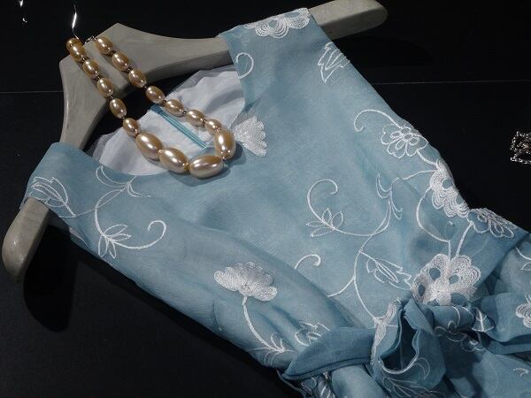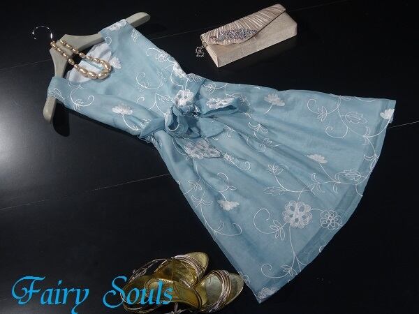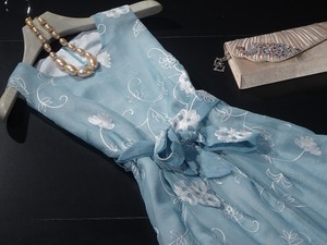 涼しげなカラ-で花柄模様の刺繍が入っていて着こなし自由のワンピ-スです。とても着心地の良い一着です。結婚式やパ-ティ-にお勧めの商品です。ウエストリボン取り外し可能。背中ファスナ-有。裏地付。ブロ-チ付き。