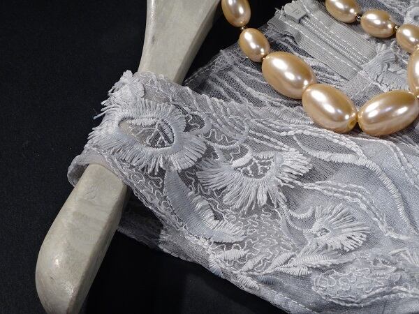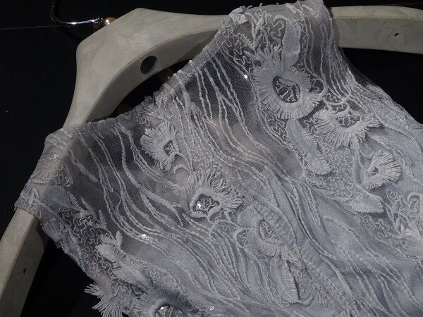 透明なスパンコ-ルでとても上品かつゴ-ジャスな総レ-スワンピ-スです。とてもエレガントな素敵な一着です。裏地付。背中ファスナ-有。