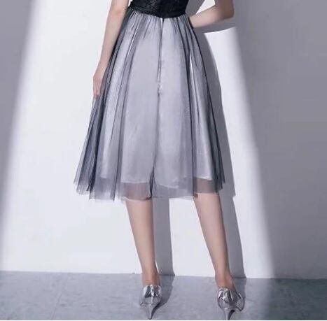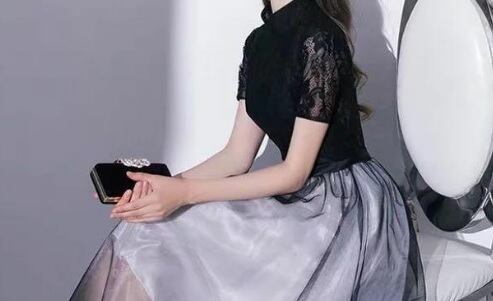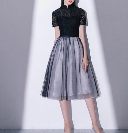 レースとシフォンの半袖ワンピース。上半身は黒のボタニカルレースを使用し、ウエストから裾にかけてはシルバーのサテン地の上に白と黒のチュールを二枚重ねボリュームを出しています。立て襟と半袖がフォーマル感を演出し、長い季節着用いただけます。パーティやイベント、結婚式など、様々なシーンで、気品のある印象を与えてくれる一枚です。裏地あり。背中ファスナ-有。胸パッド付。