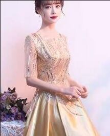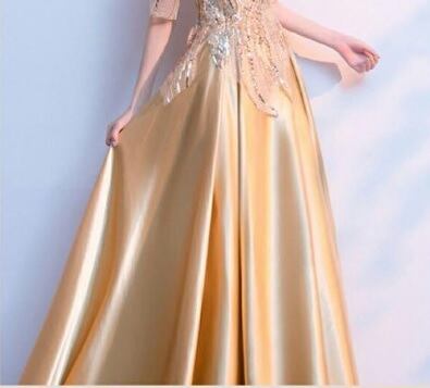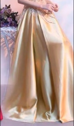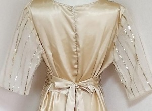 チュールとスパンコールのロングドレス。上半身は、シャンパンゴールドのサテン地の上に金のスパンコールを金糸で留めた同色のネットチュールをかぶせ、華やかな仕様になっています。スカート部分はシャンパンゴールドのサテン地をふんだんに使用しボリューム感を演出。パーティやライブ、イベントなど華やかなシーンに目を引く一着です。背中ファスナー有。胸パッド付。