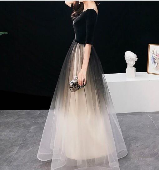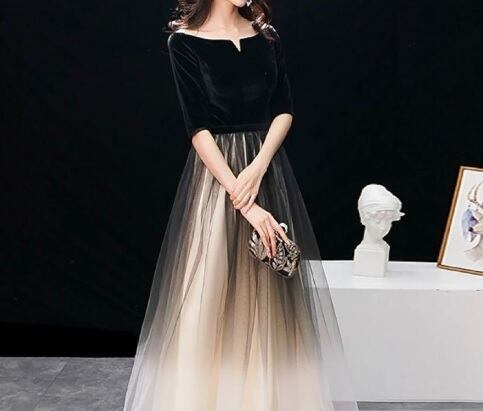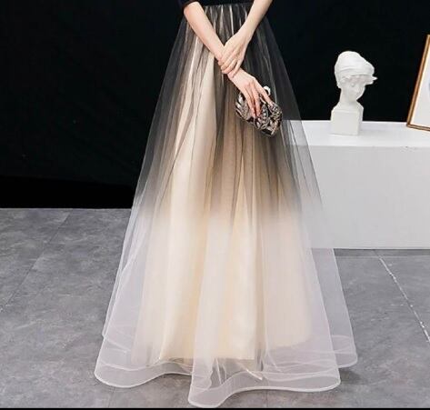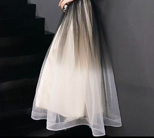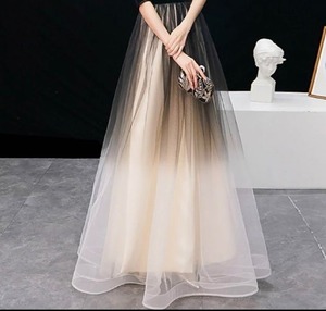 異素材パ-ティ-ロングドレスです。ウエストから裾までは、薄いゴールドベ-ジュのサテン地に黒と白のグラデーションチュールを重ね、気品に満ちたとてもエレガントで上品なデザインになっています。パーティ、結婚式の二次会、コンサートにと、フォーマルなシーンに大活躍してくれる人品です。裏地なし。背中網掛け。腰下ファスナ-有。胸パット付。