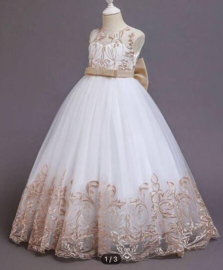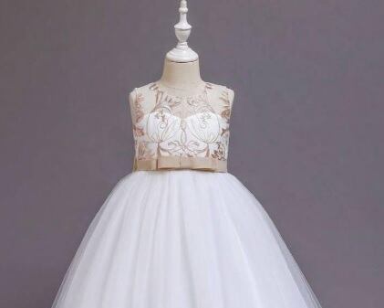 チュールのプリンセスパーティーロングドレスです。上半身には光沢のあるシャンパンゴールドの糸で刺繍をほどこし、ウエストにはサテンのリボンベルトをあしらい、すそにかけてチュールがボリューム感をだし、豪華な印象に仕上げています。背中側の大きなサテンのリボンはボタン留めになっていて取り外しが可能です。ハイウエストになっているので下半身が長く見える効果も。かわいらしいデザインで中学生・高校生の方のドレスとしても着用頂けます。結婚式、パーティ、イベントなど華やかなシーンにぴったりの一着です。背中ファスナ-有。裏地あり。