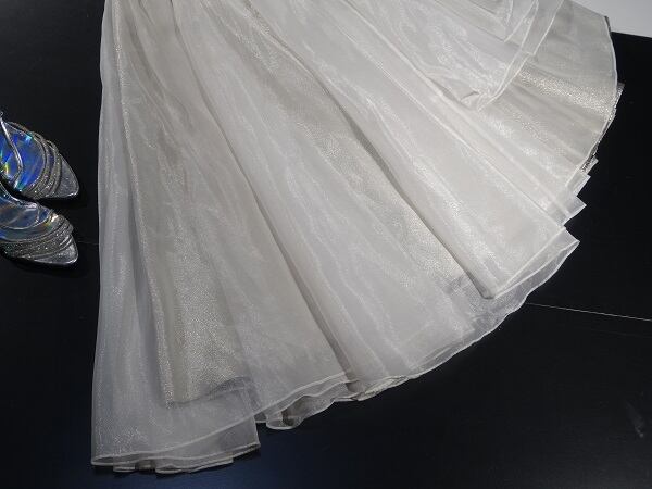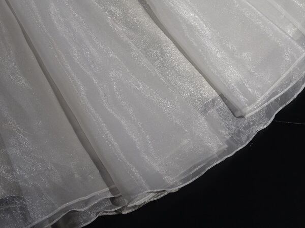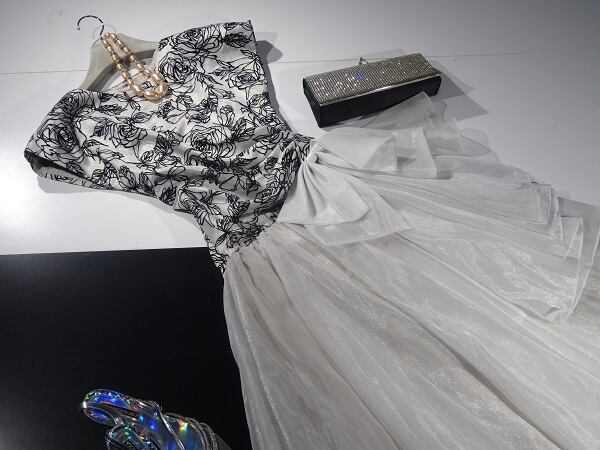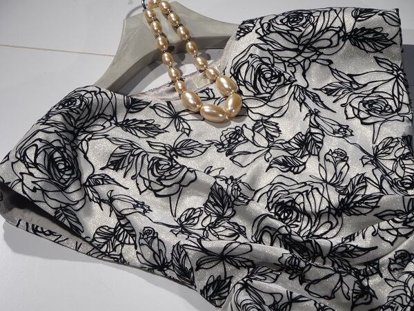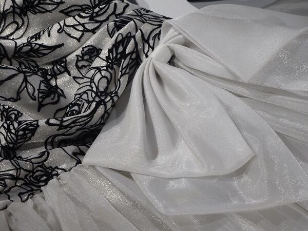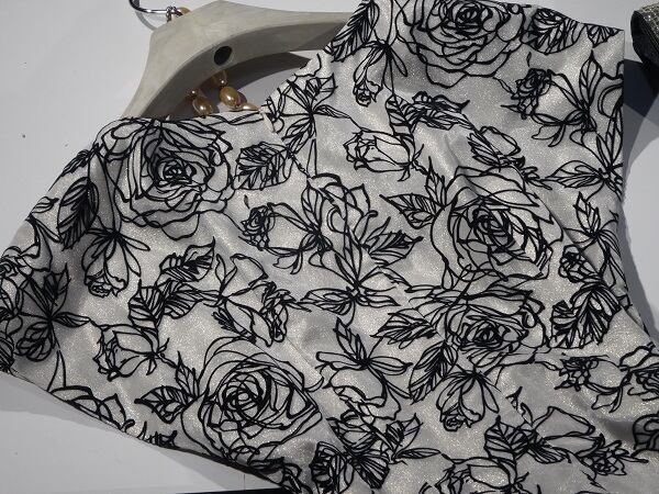 銀ラメ黒の花柄プリントオーガンジーのドレス。トップス部分は、銀ラメ地に黒の薔薇をモチーフにプリント。ウエストから裾にかけては、銀ラメ地の上に白の地オーガンジーを重ねた大変豪華でフェミニンなデザインになっています。ウエストの大きなオーガンジーのリボンがアクセントに。パーティやイベント、コンサート、結婚式にと、さまざまシーンで活躍してくれる美しい一着。背中ファスナー。裏地付。
