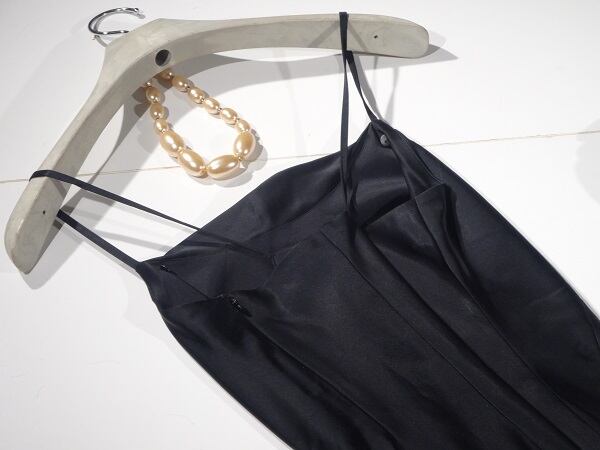 裾アンシンメトリーシックなサテンのロングドレス。胸元はほんのりドレープ仕様。シンプルなAラインから、片側が長いアンシンメトリーに。シックで上品な女性を表現してくれています。パーティやイベント、コンサート、結婚式にと、さまざまシーンで活躍してくれる美しい一着。肩ひもは調整不可。左脇下ファスナー。裏地付。