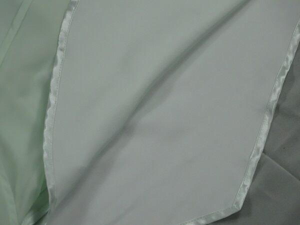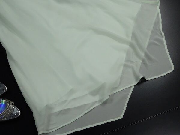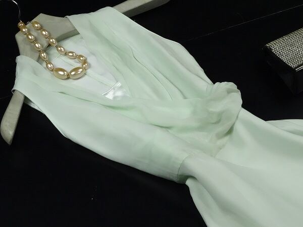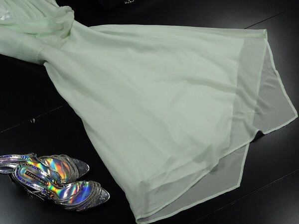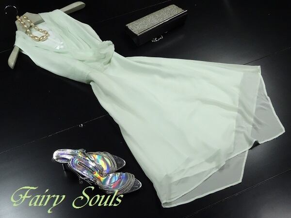 カシュクール襟と裾アンシンメトリーの爽やかドレス。色はさわやかなミントグリーン。襟元は左右合わせるカシュクール風。シンプルなAラインから、裾のアンシンメトリーへとゆるやかに流れます。ほんのりとした透け感が上品な女性を表現してくれています。パーティやイベント、コンサート、結婚式にと、さまざまシーンで活躍してくれる美しい一着。右脇下ファスナー。裏地付。