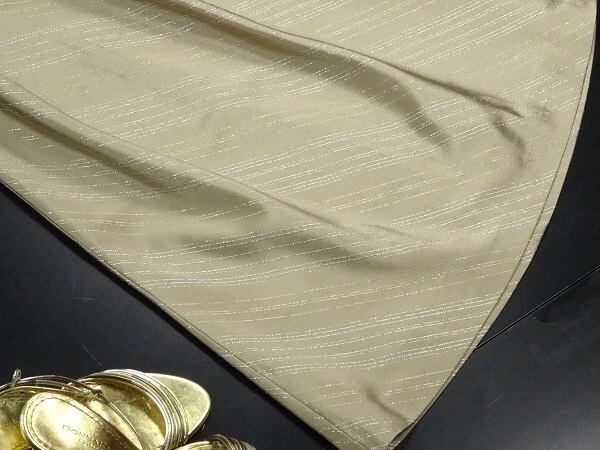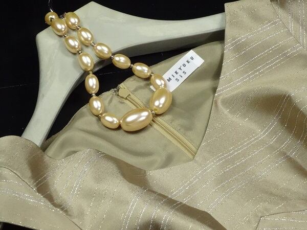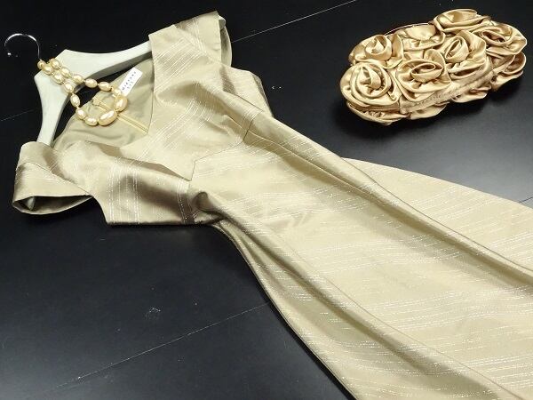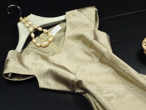 キラキラライン光沢サテンのワンピース。ラメ入りゴールドの生地に、斜めに銀糸と金糸のラインが入っています。ゆるやかなV字ラインの襟に、ちょこんと付いた袖がとてもキュートで上品な女性を表現してくれています。パーティやイベント、コンサート、結婚式にと、さまざまシーンで活躍してくれる美しい一着。背中ファスナー。裏地付。