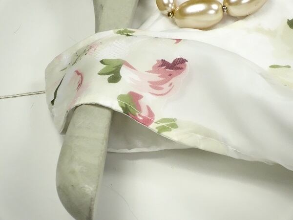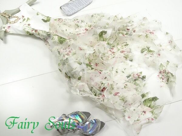 花模様のオーガンジ-マキシ丈のワンピース。薄い透け感がやわらかな印象を与えてくれています。大きなラウンドネックにノースリーブも全体の中でバランスが良く、ピュアでフェアリーなデザインになっています。煌めく太陽の光の中でも、また新緑の爽やかな風の中でも、着る人を美しく魅せてくれる一着です。前と後ろで丈の長さが違います後ろが長いです。裏地有り。右サイドファスナ-有。