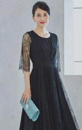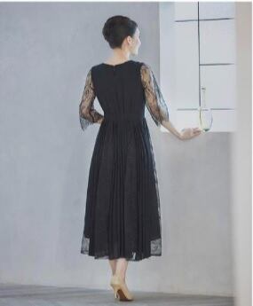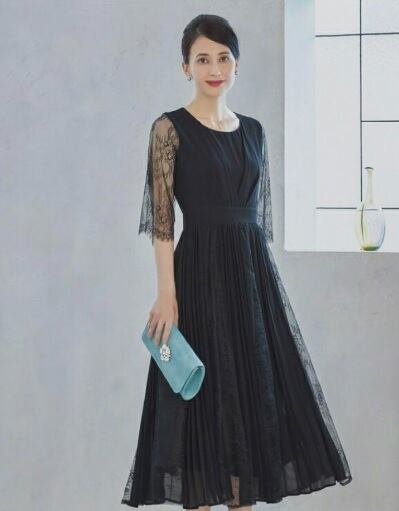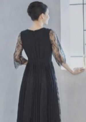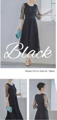 レースが美しい黒のワンピ-ス。黒のネットチュールに黒のレースをあしらったエレガントさが際立ったとても美しく高級感を醸しだしてくれているデザイン。袖をあえてレースのみにすることでエレガントな透け感を演出しています。デートにもパーティにも、どんなシーンにも重宝する一着です。裏地有。背中ファスナーあり。