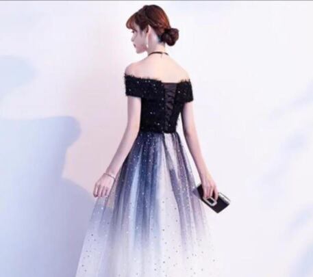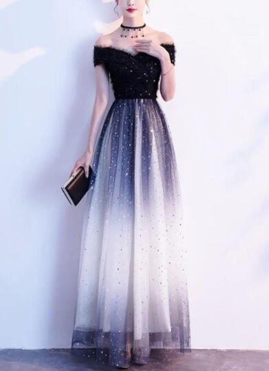 オフショルダーフリンジとスパンコールのドレス。シルバ-グレ-のサテン地の上に、上半身は黒のフリンジに黒のスパンコールをあしらい、スカート部分は黒からホワイトへと移るグラデーションのチュール地に星や丸の小さなスパンコールをちりばめた豪華でフェミニンなデザイン。シックで上品な女性を表現。パーティやイベント、コンサート、結婚式にと、さまざまシーンで活躍してくれる美しい一着。裏地なし(サテン地とチュール地の重ね)。背中編み紐掛け。腰下ファスナー。胸パット付。