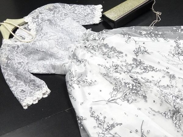 チュ-ルレースミディアムパ-ティ-ドレスです。トレンド感たっぷり色の美しいエレガントなドレスです。胸元はサテン地に刺繍が重ねられスカ-ト部分はサテン地にボタニカル刺繍が施されたチュ-ルレースが重ねられたデザインで全体的に女性度UPに仕上げられています。背中ファスナ-有。胸パット付き。裏地有。