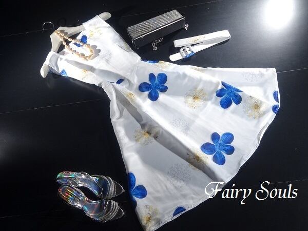 ブル-の大きな花柄がとてもゴ-ジャスで涼しげなノ-スリ-ブワンピ-スです。背中ファスナー有。ベルト付。