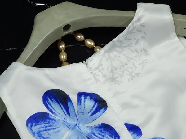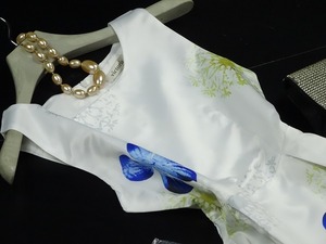 ブル-の大きな花柄がとてもゴ-ジャスで涼しげなノ-スリ-ブワンピ-スです。背中ファスナー有。ベルト付。