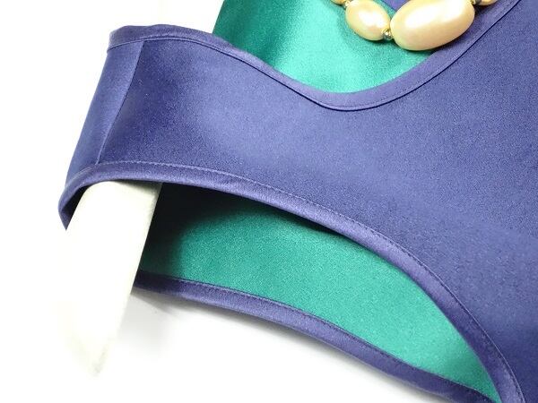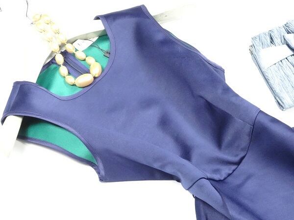 色の切替がユニークなフリル使いのワンピース。深いネイビーと綺麗な緑色があざやかに組み合わさり、シンプルなラインにフリルがエレガントさをプラスしています。厚手の生地でしっかりとした印象に。パーティやイベント、コンサート、結婚式にと、さまざまシーンで活躍してくれる大人の一着。背中ファスナー。裏地なし。