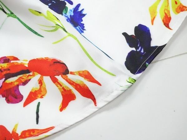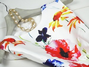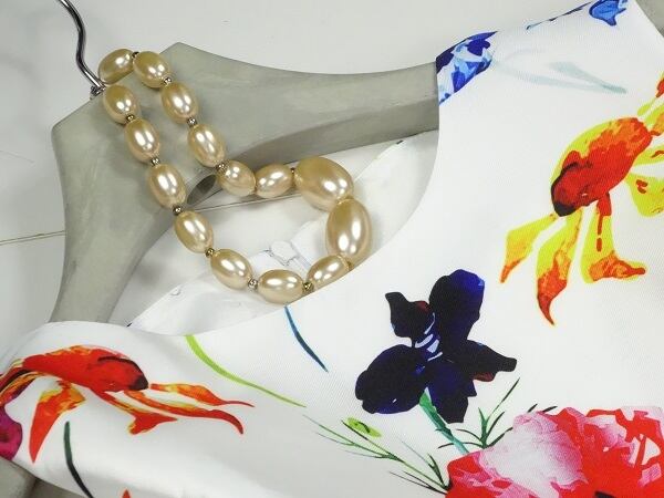 ゆったりフレア花柄プリントのワンピース。ゆるやかなラウンドネックにゆったり広がったフレアライン。つややかな白地にポップな花模様をプリント。キュートでエレガントな印象に。パーティやイベント、コンサート、結婚式にと、さまざまシーンで活躍してくれる美しい一着。背中ファスナー。裏地付。