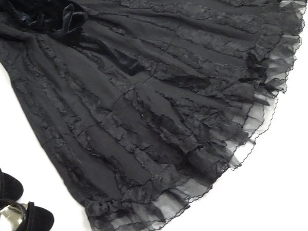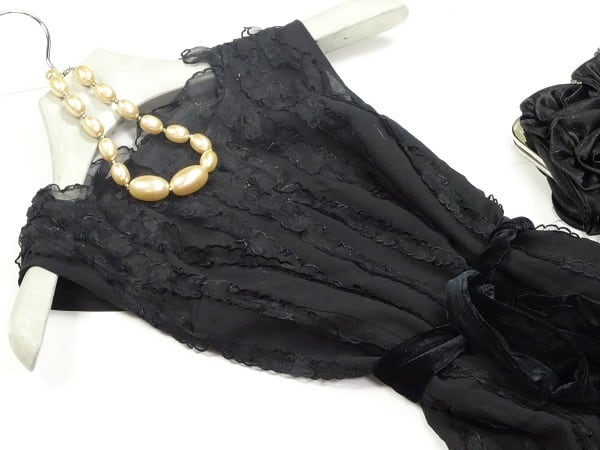縦フリルリボン飾りのワンピース。艶やかな黒の地に、黒のフリルリボンを縦に縫い付けシックでキュートな印象に。上品な女性を表現してくれています。黒のベルベットのウエストベルト付き。パーティやイベント、コンサート、結婚式にと、さまざまシーンで活躍してくれる美しい一着。背中ファスナー。裏地付。