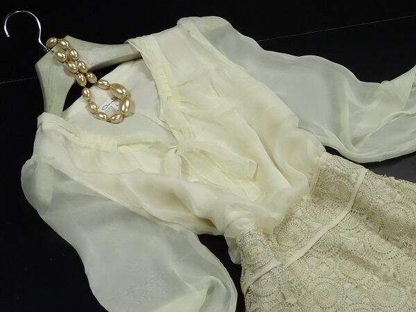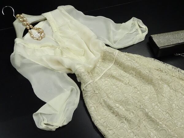 シフォンと金糸混花柄レースのワンピース。トップス部分は柔らかシフォン。スカート部分は金糸混の糸で規則的な花模様レース仕立て。ほんのりとした透け感が上品な女性を表現してくれています。パーティやイベント、コンサート、結婚式にと、さまざまシーンで活躍してくれる美しい一着。左脇下ファスナー。裏地付。