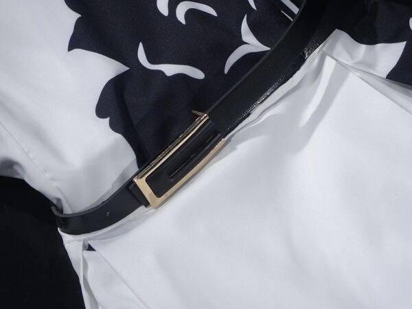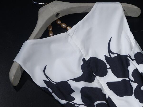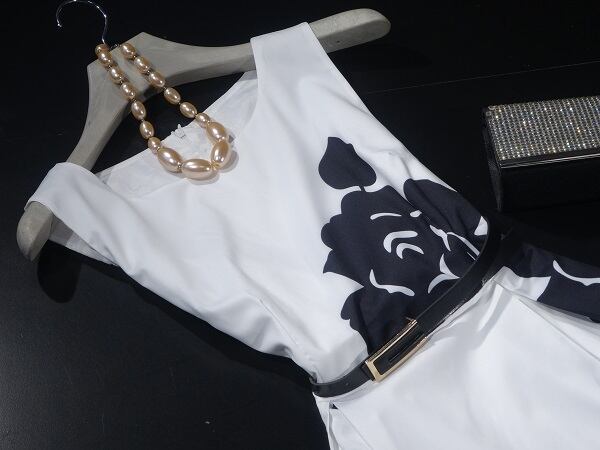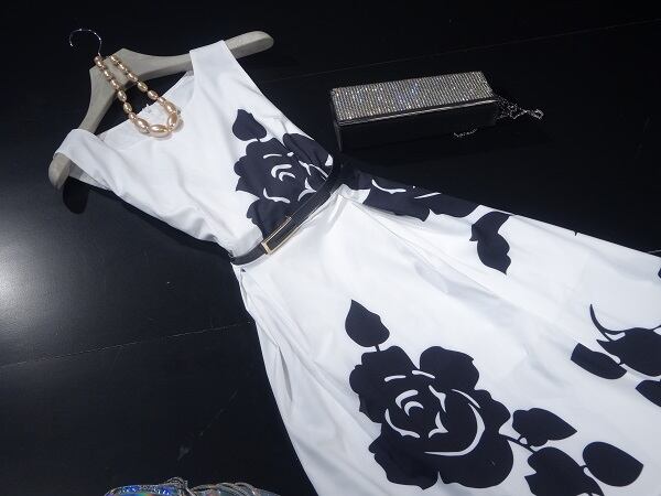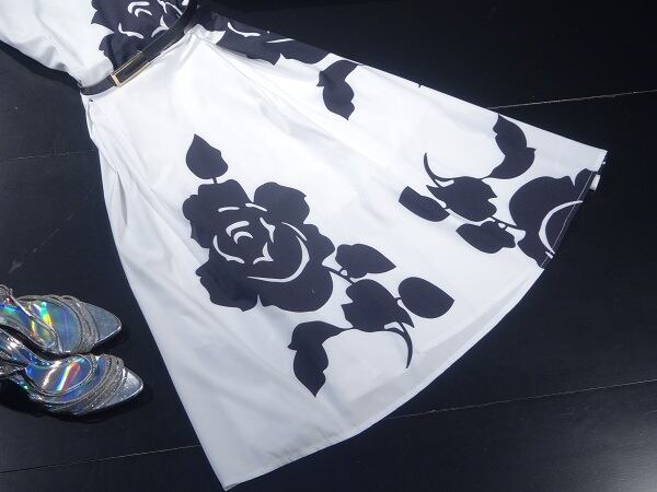 薔薇柄シフォンピュアホワイトのワンピース。マット感のある白の生地に大きな黒の薔薇柄をプリントした大胆でユニークなデザイン。ほんのりとした透け感が上品な女性を表現してくれています。パーティやイベント、コンサート、結婚式にと、さまざまシーンで活躍してくれる美しい一着。黒の細ベルト付き。背中ファスナー。裏地付。