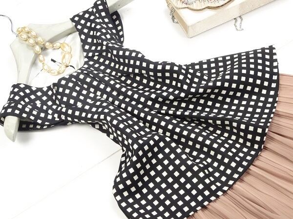 プリ-ツがとてもお洒落なデザインのワンピ-ス。スカート部分は細かい幅のプリーツ仕立て。しなやかな生地に優しい色がキュートでお洒落なイメージに。ファスナーなし(首後ろボタン1つあり)。裏地あり。